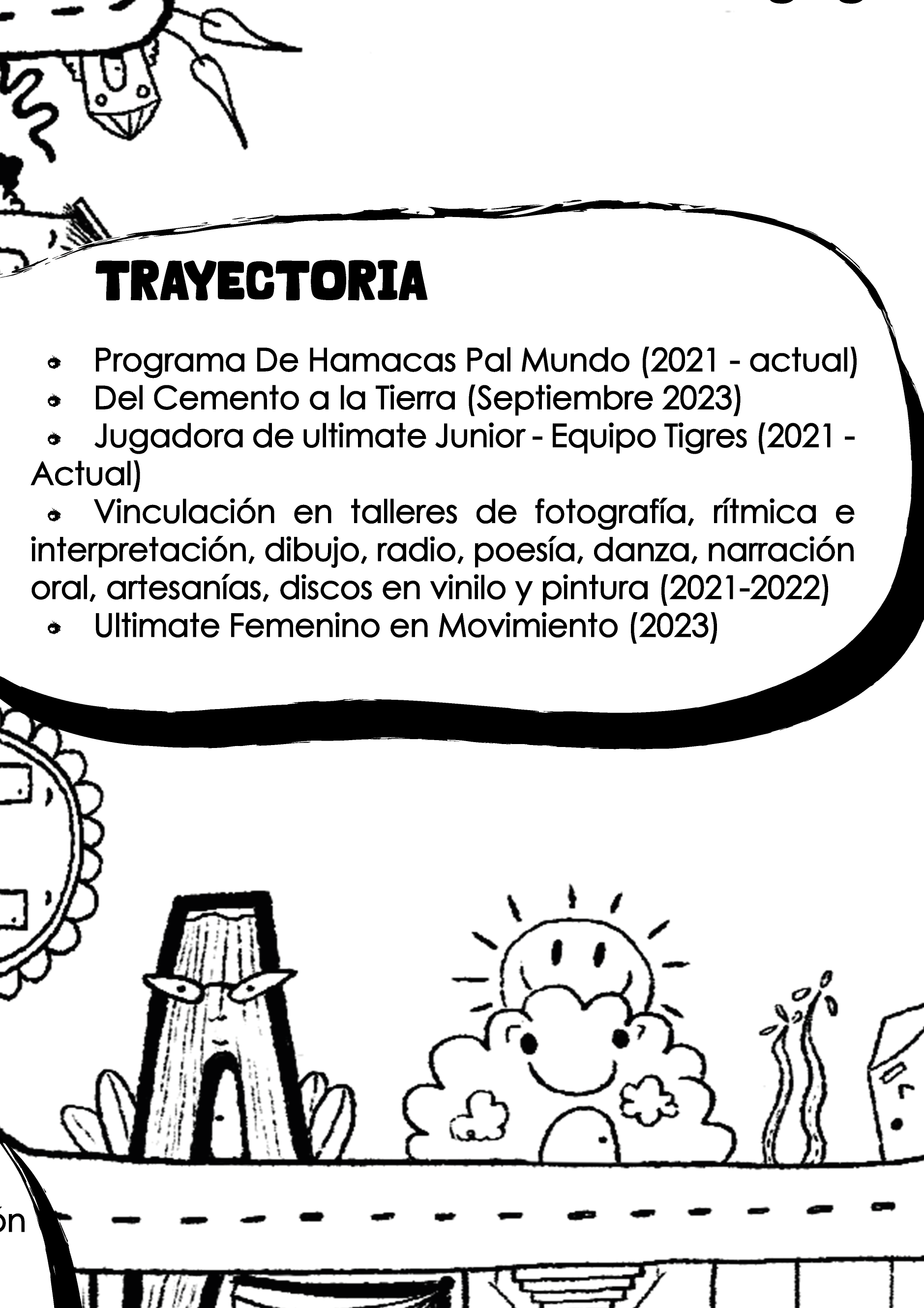 Me gusta jugar mucho ultimate y soy feliz haciéndolo, cada día me esfuerzo por ser mejor en el Ultimate como en la vida, es mi lugar seguro y me desahogo jugándolo cuando estoy estresada. Me caracterizo por escuchar, disfrutar las actividades, soy empática, me gusta aprender y ayudar a los demás.